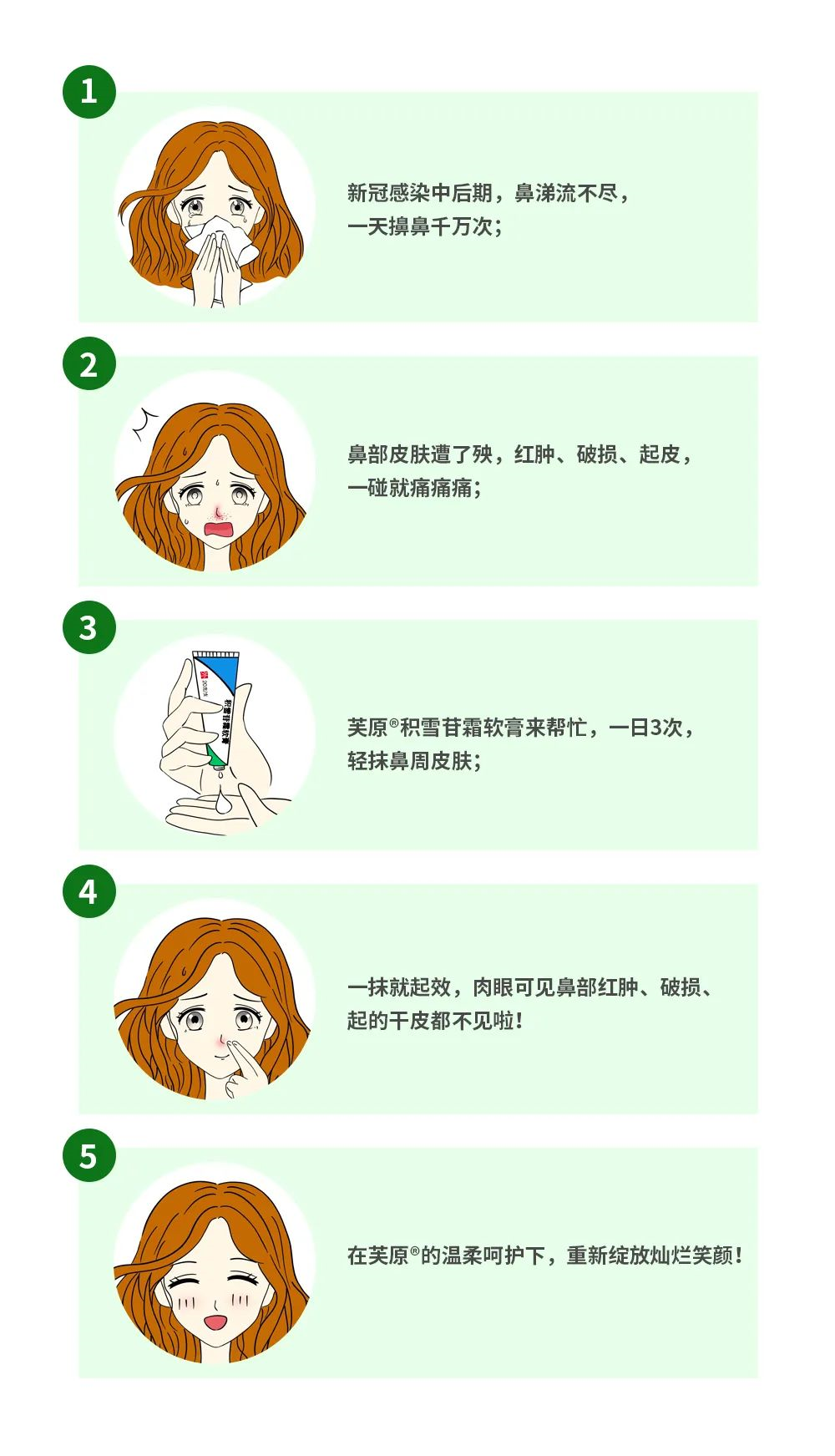 新冠感染中后期,面部和鼻部皮肤遭了殃,红肿、破损、起皮,芙原积雪苷霜软膏来帮忙,一日3次,一抹就起效,肉眼可见鼻部红肿、破损、面部起的干皮都不见啦!
