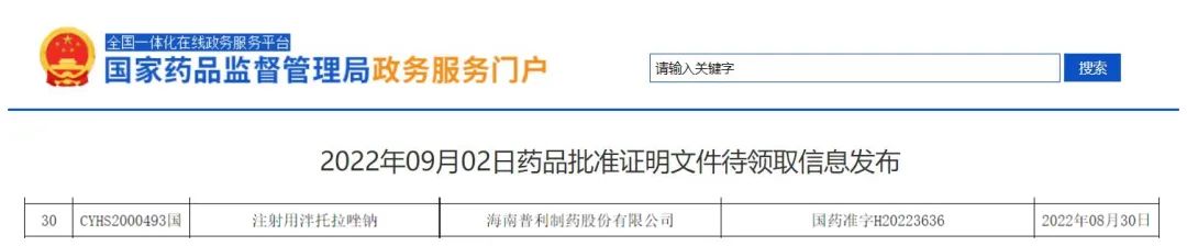 8月30日,普利制药生产的普利泮妥?注射用泮托拉唑钠通过国家药监局审批,视同通过一致性评价批准上市。